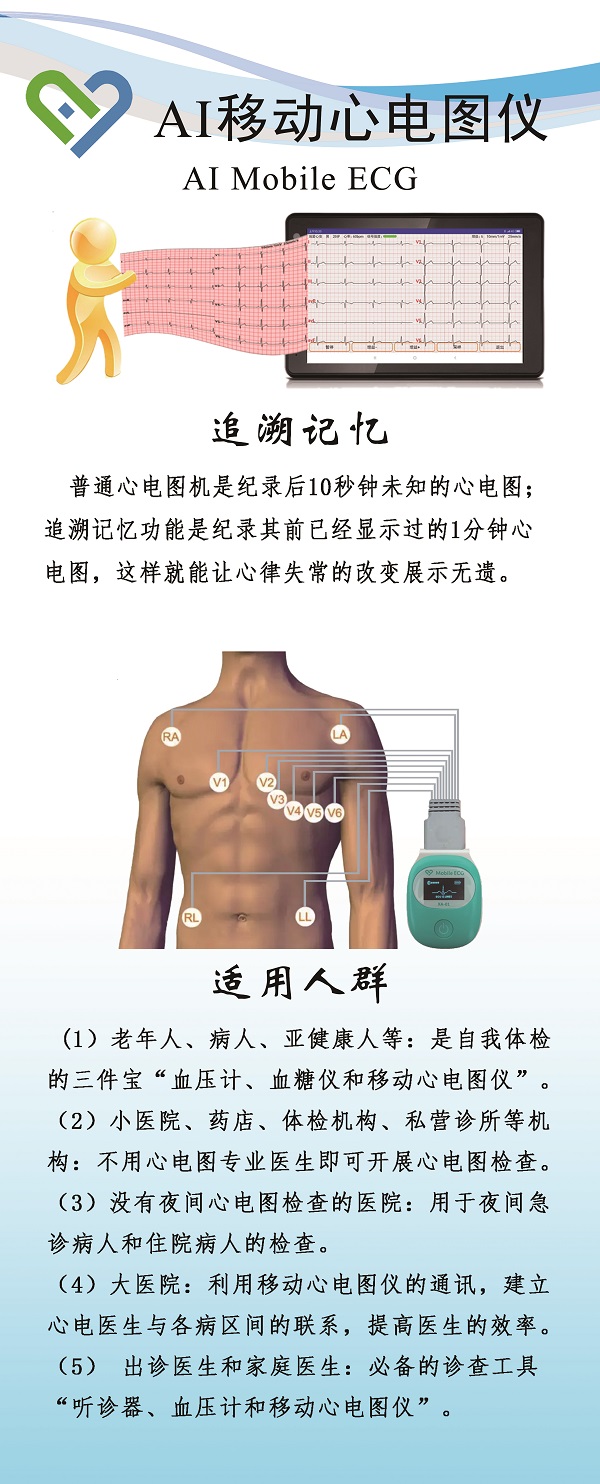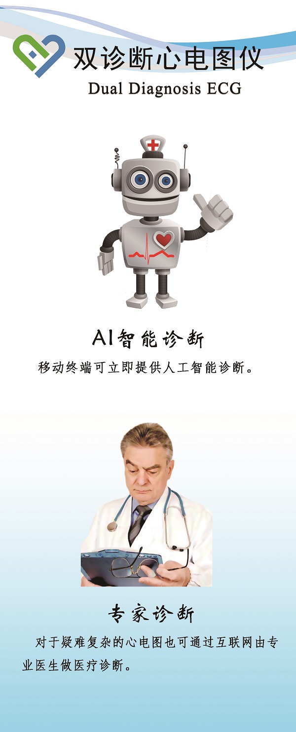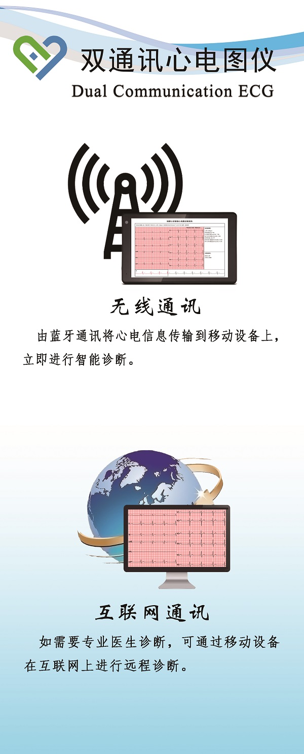移动心电图仪的双移动、双通讯和双诊断将实现这一愿望。病人在任何地方做检查,如心电图正常,则由APP的人工智能诊断发报告;如心电图不正常或有疑问,则由语音医嘱提示“心电图有疑问或不正常,请发送给医生诊断”,由病人决定是否发送。如心电图正常,病人想请医生诊断,也可发送的。这样,应用移动通讯的远程心电图传输,发送给可在另一地方的医生,来做远程的心电图会诊诊断,并将诊断报告回传给病人,实现了病人自我检查和医生诊断心电图的过程。